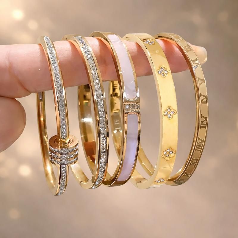 🌟·Set Details: This 5-piece bangle bracelet set is crafted from 18K stainless steel. It features a classic design, perfect for both daily wear and special occasions.