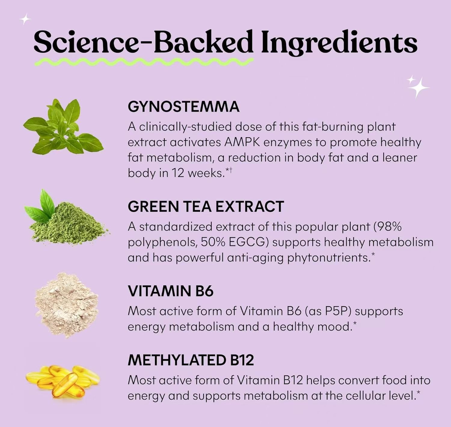 • BOOST METABOLISM: Green Tea Extract (std. to 98% polyphenols) and clinically-studied Gynostemma (Jiaogulan) activate metabolism while active forms of Vitamin B6 and methyl B12 support energy metabolism.*